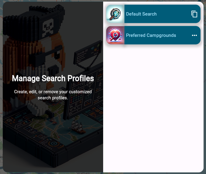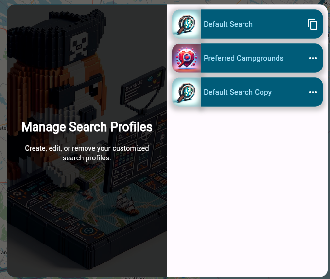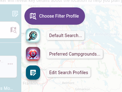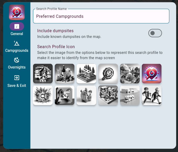 Once in the editor for a search profile you have many options that determine what markers you will see on the map. For this example, we will create a “Preferred Campgrounds” profile which we are defining as follows: