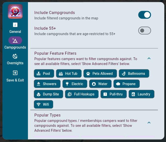 To enable specific filters, simply turn them on by clicking on them. Because there are so many options, by default we only show the most popular features and campground types initially. If you would like to explore all of the filtering options, click “Show Advanced Filters” which provides a comprehensive collection to choose from broken down into categories:
