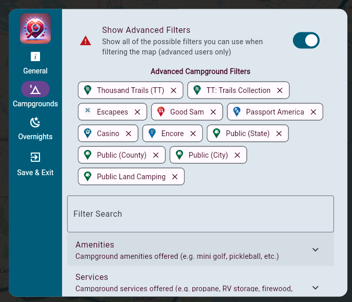 We want to filter the type of campgrounds we see to only include Thousand Trails, Encore, Good Sams, Passport America, and any public campgrounds (e.g. state, national, city, etc.)