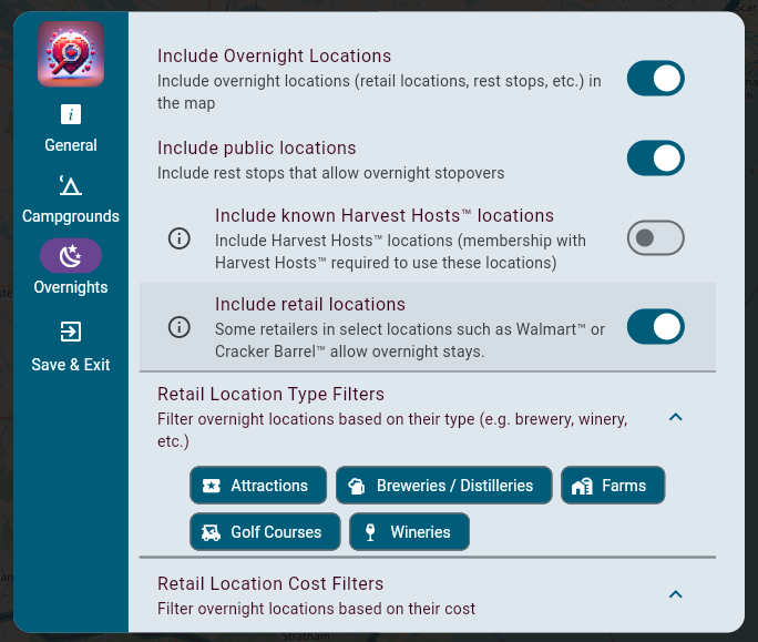 We want to include overnight stop locations such as retail locations (Walmarts, Cracker Barrels, etc.), rest areas, etc.