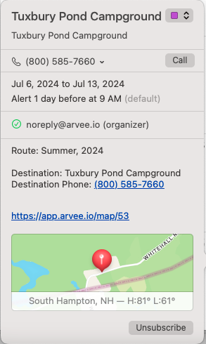 We provide three different versions of your personalized Arvee calendar: Trip dates, Reminder dates, or Both combined. Trip dates provide the actual date-blocks of each destination as an all-day event for your calendar across all of your active trips. Reminders, on the other hand, provide just the reminder events based on those trip dates. Click the copy icon next to each URL to copy it to your clipboard and paste it into your calendar application as an iCAL subscription — it’s that simple! Once the calendar is refreshed by your calendar application, you will be able to see them alongside all of your other events: