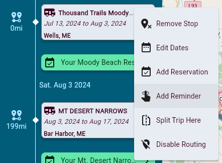 To create this reminder, click the menu icon of a destination in your trip and click “Add Reminder”: