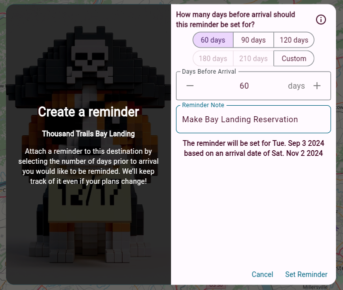 This will bring up a dialog that will allow you to describe the reminder (for example “Make reservation for Bay Landing”) and define the number of days before your arrival date this reminder should be for (e.g. 60 days):