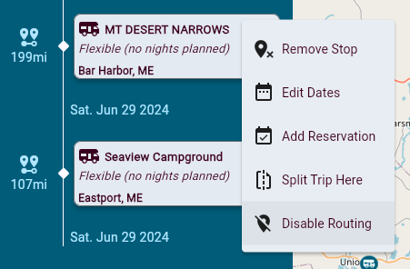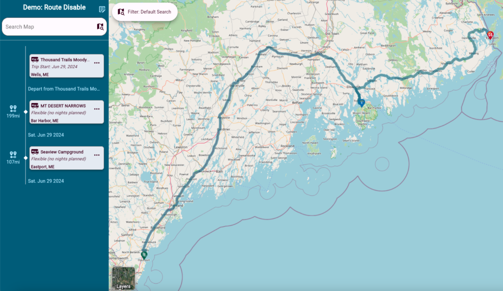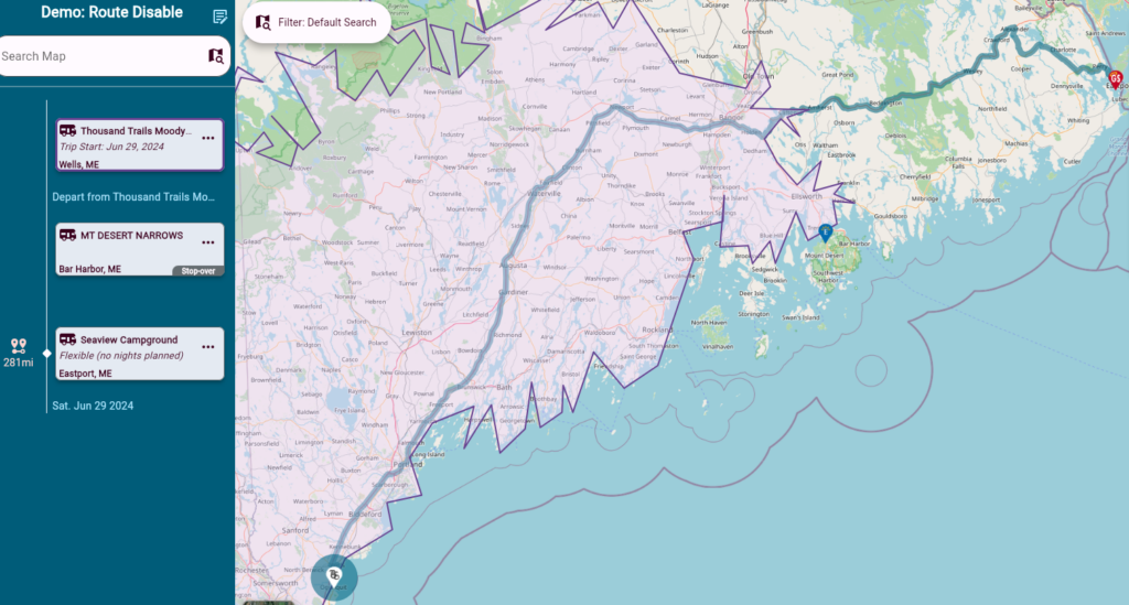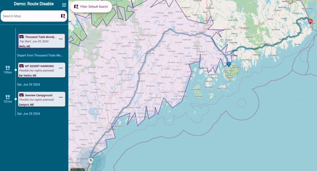Armed with this information I can start looking around for a suitable campground along my new route, add it to my trip, and only when I’m happy with everything do I need to delete the original Mt. Desert Narrows destination. If it turns out the plans won’t work, it’s easily reversed by just re-enabling the routing for the destination I turned off.