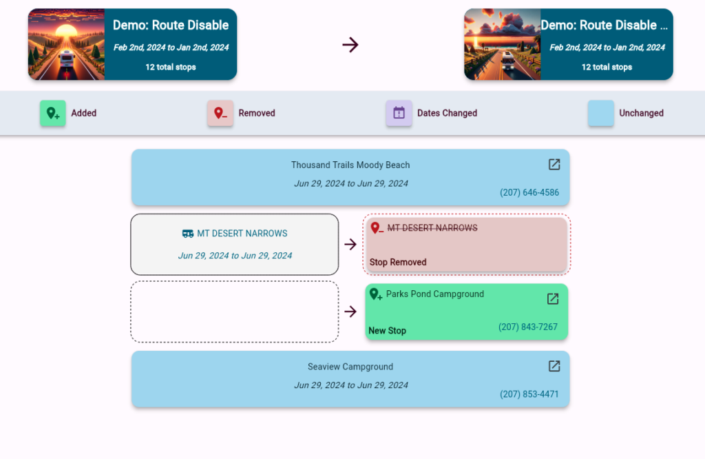 Here is what Arvee’s trip comparison tool looks like. In this case, you can see as compared to the original trip our start and finish points in our trip haven’t changed, but we’ve removed Mt. Desert Narrows from the trip and instead added Parks Pond in Clifton.